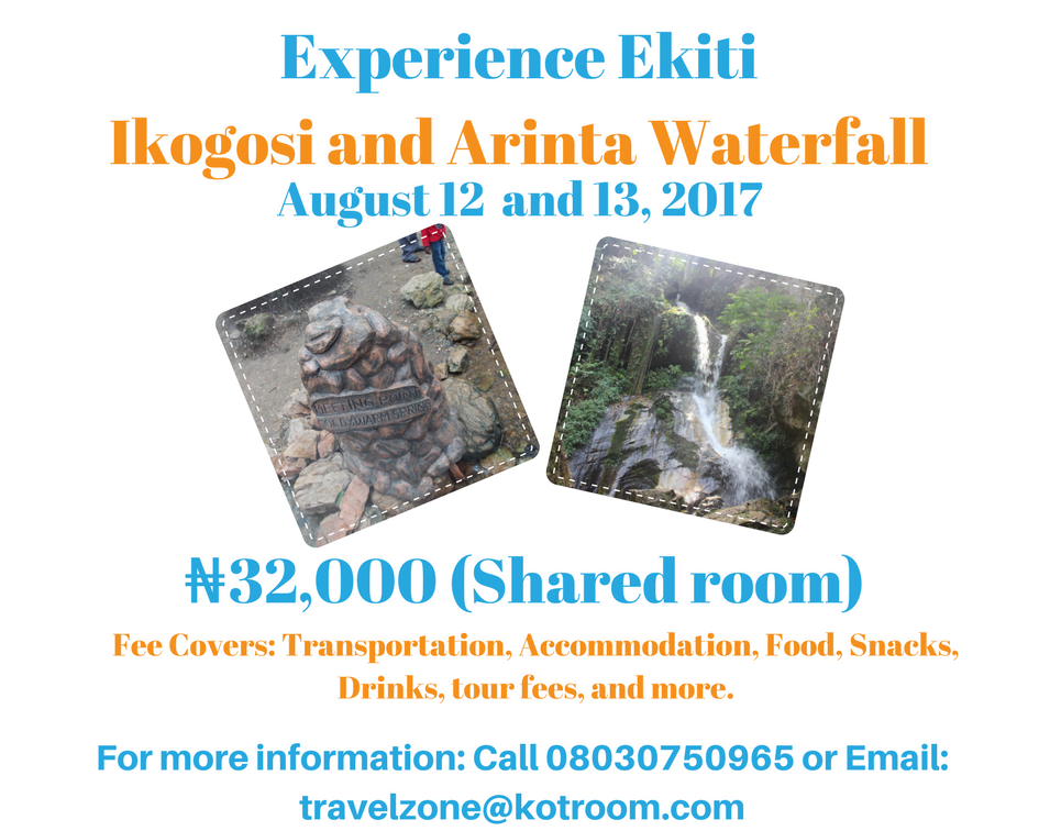 It is #TravelTuesdaywithZeeGoes and TravelKotRoom has an awesome offer for those that want to check out Ekiti, the land of the brave and intellectuals Home of the warm and cold spring. Home of the Ikogosi warm and cold springs and Arinta waterfall.